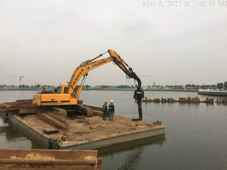 Công tác đóng cừ lazen giữa lòng hồ Đại Nhật