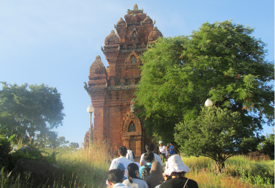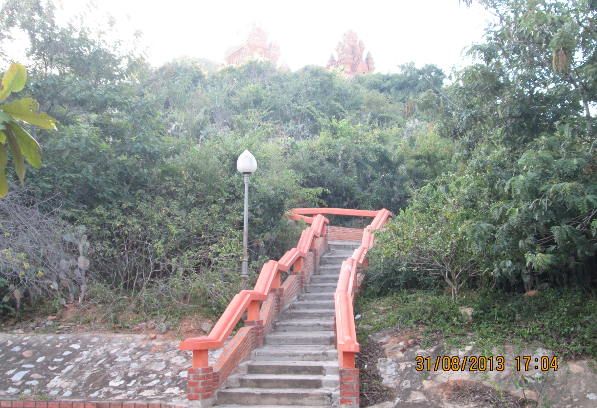 Khoảng 3h cả đoàn lên xe hướng tới Tháp Chàm. Cảnh ở đây đẹp vô cùng, vừa tới Tháp bạn sẽ có cảm giác thích thú, thoải mái ngay với không gian êm ắng, không khí trong lành, khuôn viên rộng lớn, màu xanh của lá hòa quyện với ánh nắng dịu nhẹ làm cho phong cảnh ở đây càng rực rỡ hơn. Muốn lên được Tháp Chàm, bạn phải đi qua những bậc thang xuyên qua cánh rừng, bạn sẽ có cảm giác mình như đang lên đỉnh núi cao.
