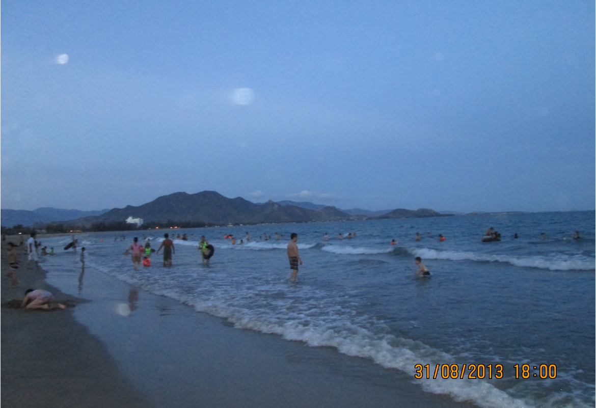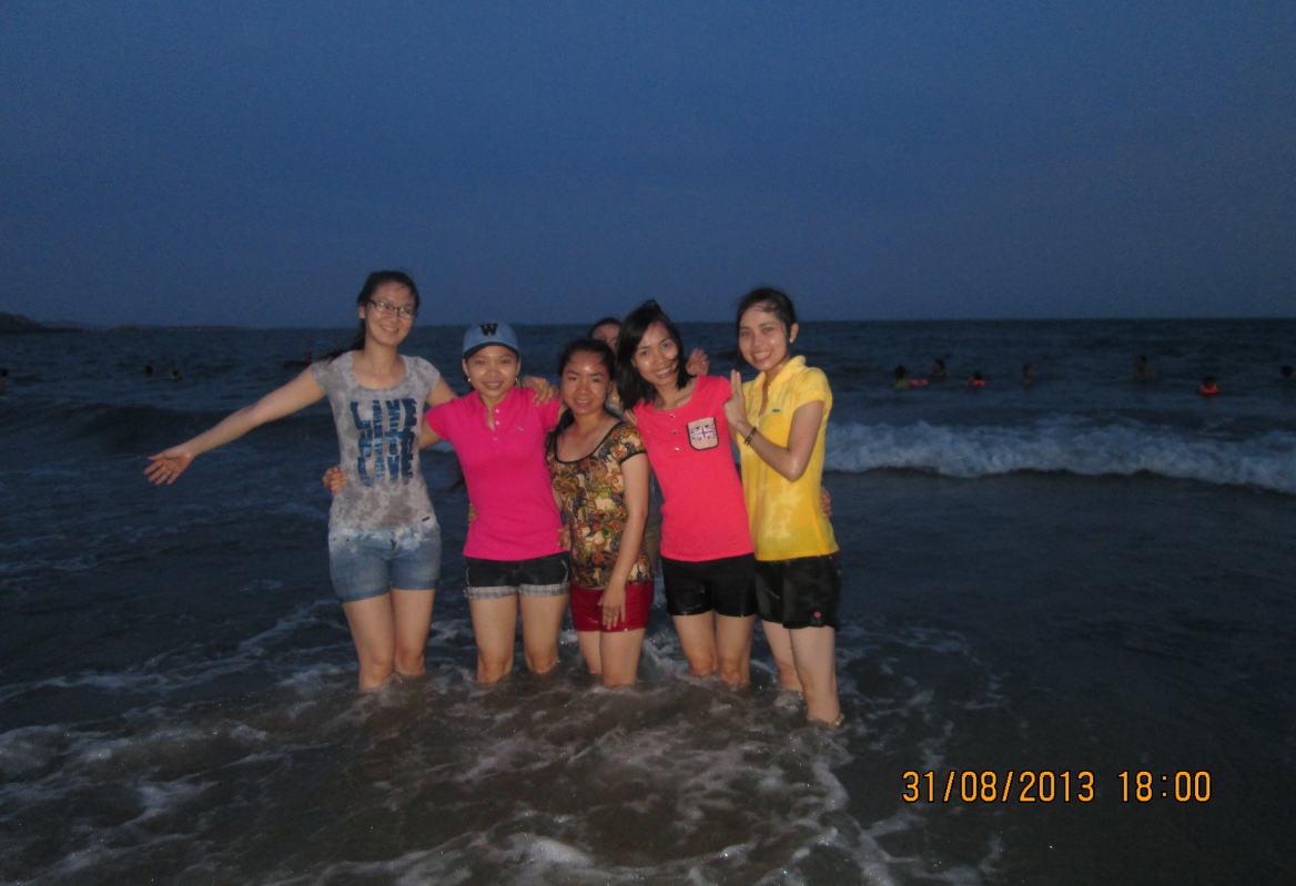 Tham quan Tháp xong chúng tôi lại về khách sạn và chuẩn bị đồ ra tắm biển chiều. Về đến khách sạn là 17h, bầu trời đã sụp tối nhưng biển ở đây vẫn mát và thu hút nhiều người đến tắm, còn cả bọn con gái chúng tôi chỉ thích nghịch nước, đùa với sóng, chụp hình biển đêm.